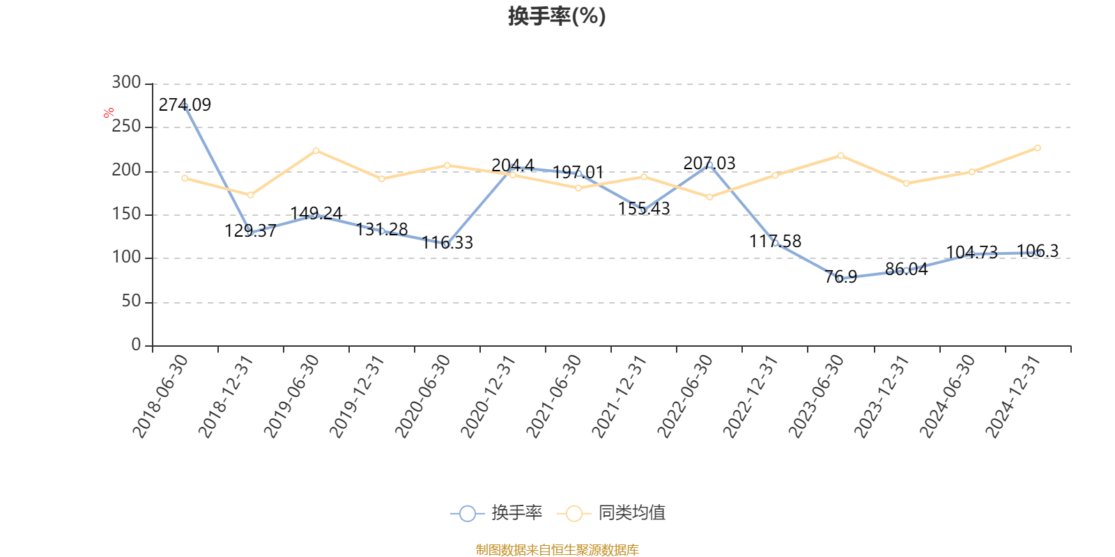 截至2024年12月31日,基金最近一年换手率约217.53%,持续2年低于同类均值。