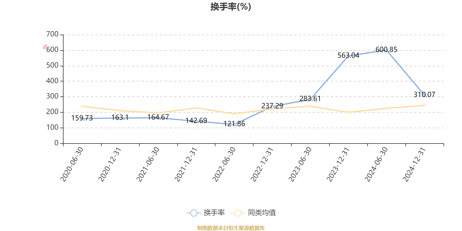 截至2024年12月31日,基金最近一年换手率约905.46%,持续2年高于同类均值。