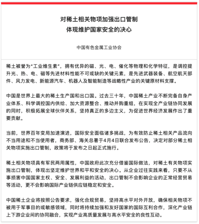 4月6日,中国有色金属工业协会发文称,稀土相关物项具有军民两用属性,中国政府此次充分借鉴国际做法,对稀土有关物项实施出口管制,体现出坚定维护世界和平和安全的决心。从企业过往实践来看,只要不从事损害中国国家主权、安全、发展利益的活动,出口管制不会影响企业的正常经营贸易等活动,更不会影响国际产业链供应链稳定和安全。