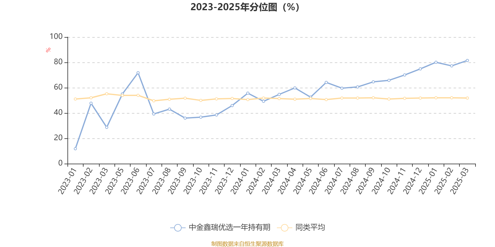 通过所选区间该基金净值增长率分位图,可以观察该基金与同类基金业绩比较情况。图为坐标原点到区间内某时点的净值增长率在同类基金中的分位数。