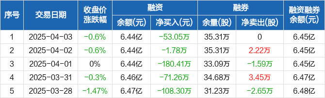 融资方面,当日融资买入894.17万元,融资偿还947.22万元,融资净偿还53.05万元,连续10日净偿还累计2532.86万元。融券方面,融券卖出0股,融券偿还0股,融券余量35.31万股,融券余额116.88万元。融资融券余额合计6.45亿元。