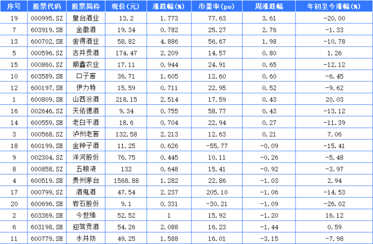 2025年4月3日,同花顺数据显示,本周20只白酒A股11家上涨,9家下跌。