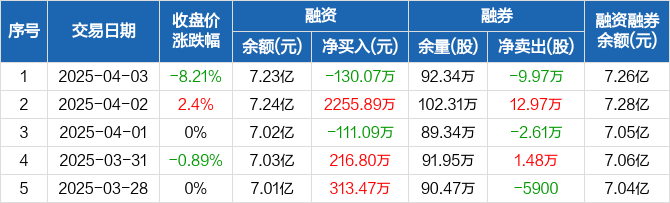 融资方面,当日融资买入6399.4万元,融资偿还6529.46万元,融资净偿还130.07万元。融券方面,融券卖出5.64万股,融券偿还15.61万股,融券余量92.34万股,融券余额289.02万元。融资融券余额合计7.26亿元。