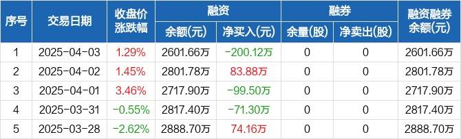 华业香料融资融券信息显示,2025年4月3日融资净偿还200.12万元;融资余额2601.66万元,创历史新低,较前一日下降7.14%。