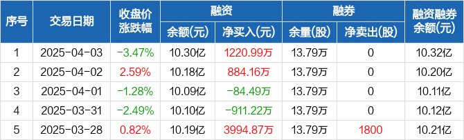 融资方面,当日融资买入7985.98万元,融资偿还6764.99万元,融资净买入1220.99万元。融券方面,融券卖出0股,融券偿还0股,融券余量13.79万股,融券余额210.85万元。融资融券余额合计10.32亿元。