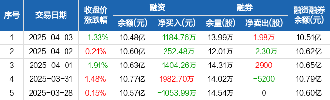 融资方面,当日融资买入2857.37万元,融资偿还4042.14万元,融资净偿还1184.76万元,连续3日净偿还累计2841.5万元。融券方面,融券卖出2.47万股,融券偿还4900股,融券余量13.99万股,融券余额269.87万元。融资融券余额合计10.51亿元。