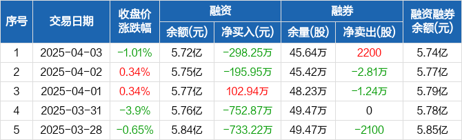 融资方面,当日融资买入1449.22万元,融资偿还1747.47万元,融资净偿还298.25万元。融券方面,融券卖出2200股,融券偿还0股,融券余量45.64万股,融券余额134.64万元。融资融券余额合计5.74亿元。