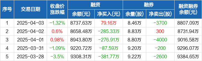 融资方面,当日融资买入373.54万元,融资偿还294.38万元,融资净买入79.16万元。融券方面,融券卖出0股,融券偿还3700股,融券余量8.46万股,融券余额69.46万元。融资融券余额合计8807.09万元。