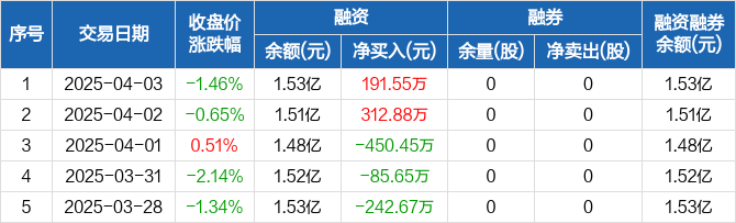融资方面,当日融资买入1043.73万元,融资偿还852.17万元,融资净买入191.55万元。融券方面,融券卖出0股,融券偿还0股,融券余量0股,融券余额0元。融资融券余额合计1.53亿元。
