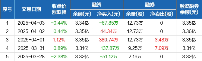 雷科防务融资融券信息显示,2025年4月3日融资净偿还67.85万元;融资余额3.34亿元,较前一日下降0.2%。