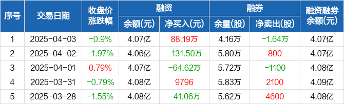 融资方面,当日融资买入167.96万元,融资偿还79.77万元,融资净买入88.19万元。融券方面,融券卖出0股,融券偿还1.64万股,融券余量4.16万股,融券余额41.1万元。融资融券余额合计4.07亿元。