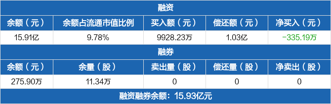 融资方面,当日融资买入9928.23万元,融资偿还1.03亿元,融资净偿还335.19万元。融券方面,融券卖出0股,融券偿还0股,融券余量11.34万股,融券余额275.9万元。融资融券余额合计15.93亿元。