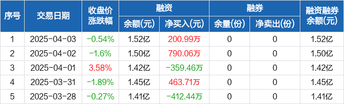 融资方面,当日融资买入1184.77万元,融资偿还983.78万元,融资净买入200.99万元。融券方面,融券卖出0份,融券偿还0份,融券余量0份,融券余额0元。融资融券余额合计1.52亿元。