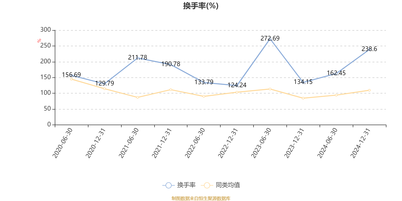 截至2024年12月31日,基金最近一年换手率约402.28%,持续高于同类均值。
