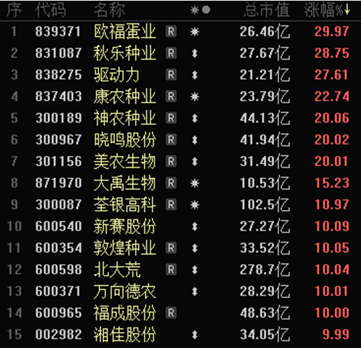板块内神农种业、晓鸣股份、美农生物等多只个股涨停。河南上市公司秋乐种业涨超28%,逼近30CM涨停。