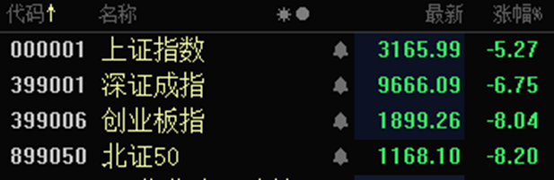 【大河财立方记者陈玉尧】4月7日,A股三大股指集体大跌。截至发稿,上证指数跌5.27%,深证成指跌6.75%,创业板指跌8.04%。全市场近5200只个股下跌,其中3116只跌幅超9%。