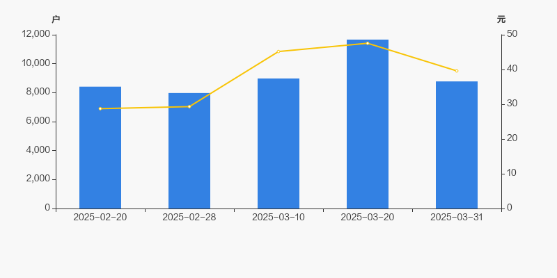 2025年2月20日至今,公司股东户数有所增长,区间涨幅为4.31%。2025年2月20日至2025年3月31日区间股价上涨37.84%。