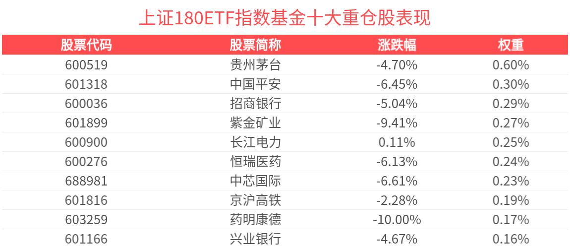 数据显示,截至2025年3月31日,上证180指数(000010)前十大权重股分别为贵州茅台(600519)、中国平安(601318)、紫金矿业(601899)、招商银行(600036)、恒瑞医药(600276)、长江电力(600900)、药明康德(603259)、中芯国际(688981)、京沪高铁(601816)、兴业银行(601166),前十大权重股合计占比25.09%。