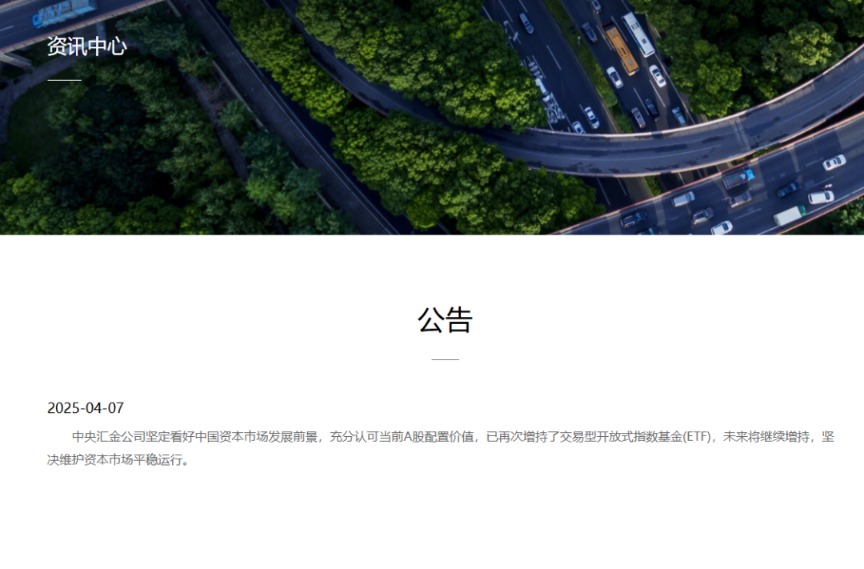 4月7日,中央汇金公司公告称,中央汇金公司坚定看好中国资本市场发展前景,充分认可当前A股配置价值,已再次增持了交易型开放式指数基金(ETF),未来将继续增持,坚决维护资本市场平稳运行。