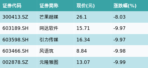 截至收盘,虚拟数字人主题涨跌幅最高的五只股票为:芒果超媒(300413.SZ)、网达软件(603189.SH)、引力传媒(603598.SH)、风语筑(603466.SH)与元隆雅图(002878.SZ)。详情见下表: