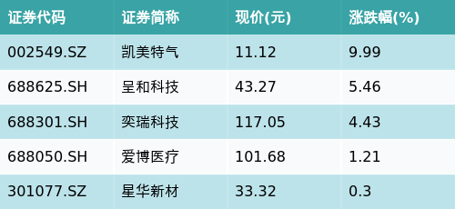 截至收盘,专精特新主题涨跌幅最高的五只股票为:凯美特气(002549.SZ)、呈和科技(688625.SH)、奕瑞科技(688301.SH)、爱博医疗(688050.SH)与星华新材(301077.SZ)。详情见下表: