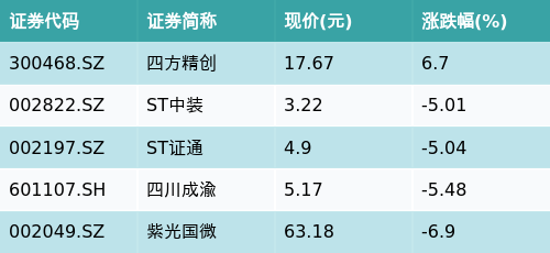 截至收盘,数字货币主题涨跌幅最高的五只股票为:四方精创(300468.SZ)、ST中装(002822.SZ)、ST证通(002197.SZ)、四川成渝(601107.SH)与紫光国微(002049.SZ)。详情见下表: