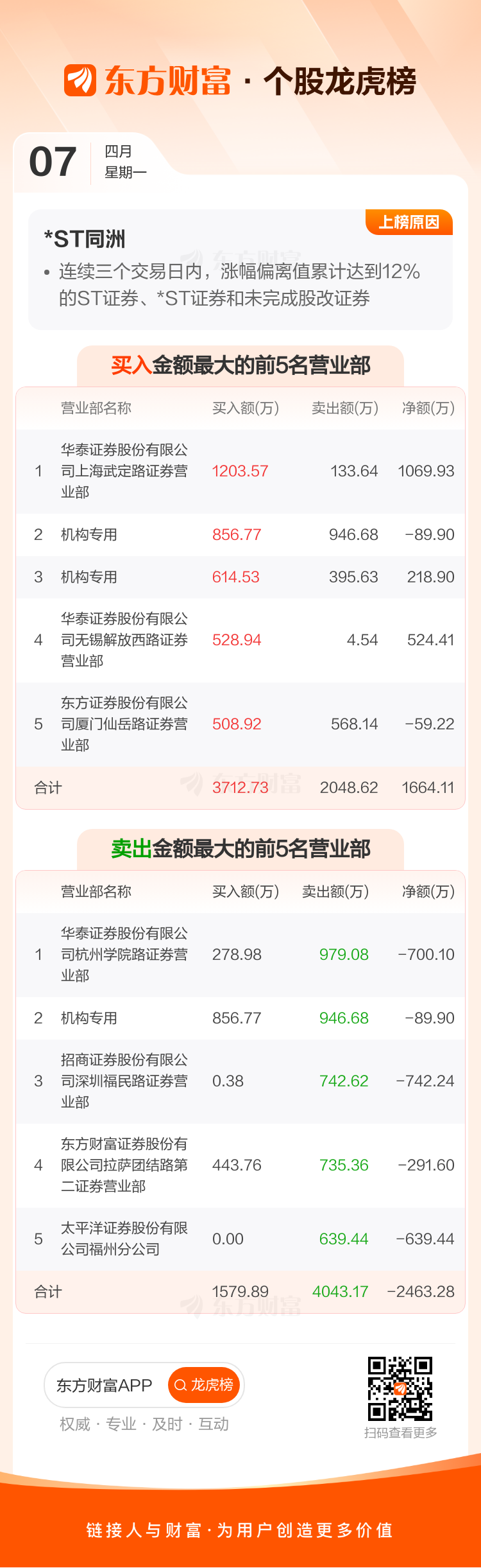 交易所2025年4月7日公布的交易公开信息显示,*ST同洲因成为连续三个交易日内,涨幅偏离值累计达到12%的ST证券、*ST证券和未完成股改证券上榜。*ST同洲当日收报6.29元,涨跌幅-4.98%,换手率1.80%,成交额8529.39万。异常期间4月2日至4月7日,期间涨幅0.48%,累计偏离值12.16%,区间成交额3.27亿。