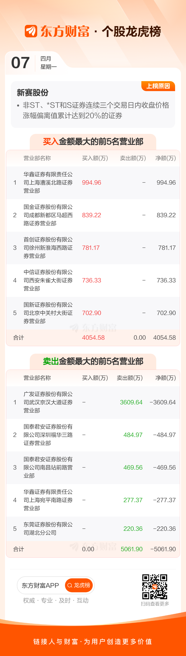 交易所2025年4月7日公布的交易公开信息显示,新赛股份因成为有价格涨跌幅限制的日收盘价格涨幅偏离值达到7%的前五只证券、非ST、*ST和S证券连续三个交易日内收盘价格涨幅偏离值累计达到20%的证券上榜。新赛股份当日收报4.69元,涨跌幅10.09%,偏离值17.43%,换手率5.12%,成交额1.40亿。异常期间4月3日至4月7日,期间涨幅21.19%,累计偏离值28.75%,区间成交额2.61亿。