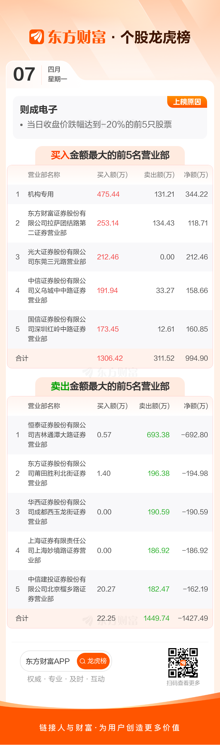 交易所2025年4月7日公布的交易公开信息显示,则成电子因成为当日收盘价跌幅达到-20%的前5只股票上榜。则成电子当日收报26.49元,涨跌幅-27.96%,偏离值-27.96%,换手率9.19%,成交额1.35亿。