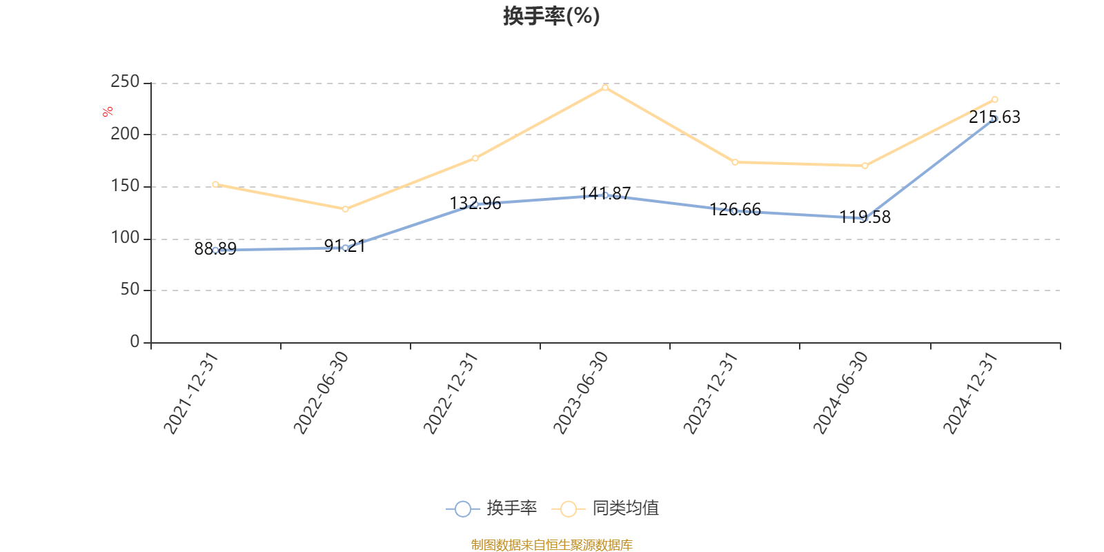 截至2024年12月31日,基金最近一年换手率约336.51%,持续低于同类均值。