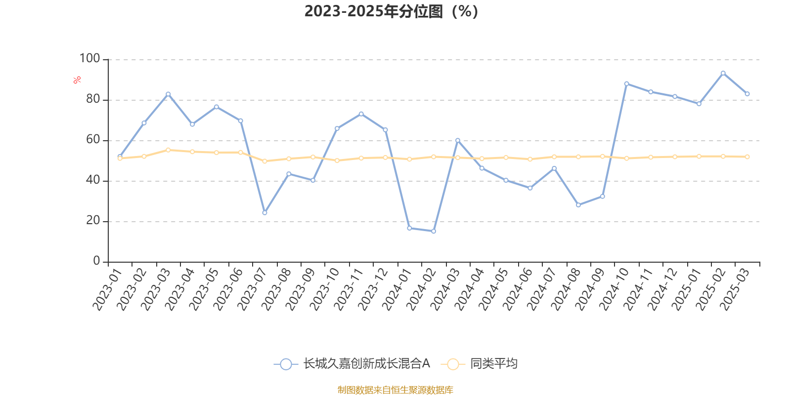 通过所选区间该基金净值增长率分位图,可以观察该基金与同类基金业绩比较情况。图为坐标原点到区间内某时点的净值增长率在同类基金中的分位数。