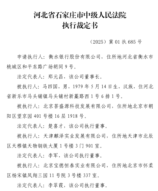 据了解,衡水银行于2025年3月16日申请强制执行。执行过程中,法院查明此前已对被执行人名下的多家农村商业银行股权进行了保全冻结,具体包括:马四国持有的朔州农村商业银行2000万股股权;北京菩盛源科技发展有限公司持有的包头农商行7349.4万股股权;天津麒泽实业发展有限公司持有的包头农商行6024.1万股股权以及北京宝德恒泰实业有限公司持有的潍坊农村商业银行6143.8万股股权。