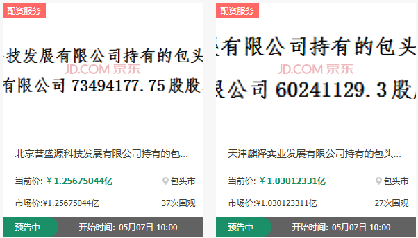 近日,京东司法拍卖平台发布的信息显示,北京菩盛源科技发展有限公司、天津麒泽实业发展有限公司分别持有的包头农村商业银行(下称“包头农商行”)7349.4万股、6024.1万股股份,将于2025年5月初在该平台公开拍卖,起拍价分别约为1.26亿元和1.03亿元。以包头农商行总股本计算,两笔股权合计占比约11.07%。