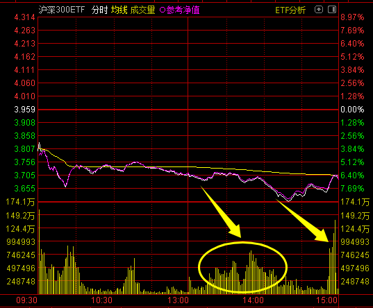 今天盘中,市场出现了一个积极现象,那就是有资金抄底ETF。上证50及沪深300方向的ETF均大幅放量,比如上证50ETF(510050)、沪深300ETF(510300)等。另外,创业板ETF(159915)也有所放量。