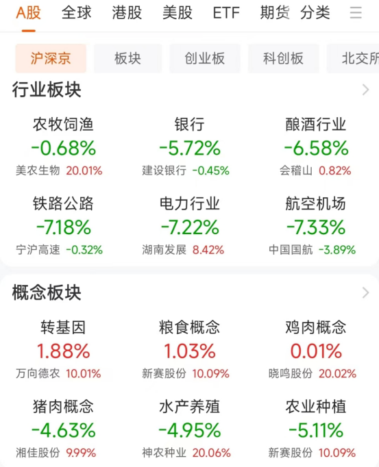 4月7日A股三大指数尾盘跌幅均有所收窄,至收盘时沪指跌7.34%,深成指跌9.66%,创业板指跌12.5%。两市成交额1.59万亿元,较上一交易日放量4502亿元。盘面上,农业股表现亮眼,转基因、粮食概念方向领涨。电池、软件开发、消费电子等板块跌幅居前。