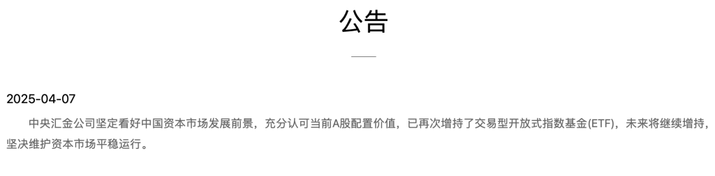 4月7日,中央汇金公告称,中央汇金公司坚定看好中国资本市场发展前景,充分认可当前A股配置价值,已再次增持了交易型开放式指数基金(ETF),未来将继续增持,坚决维护资本市场平稳运行。