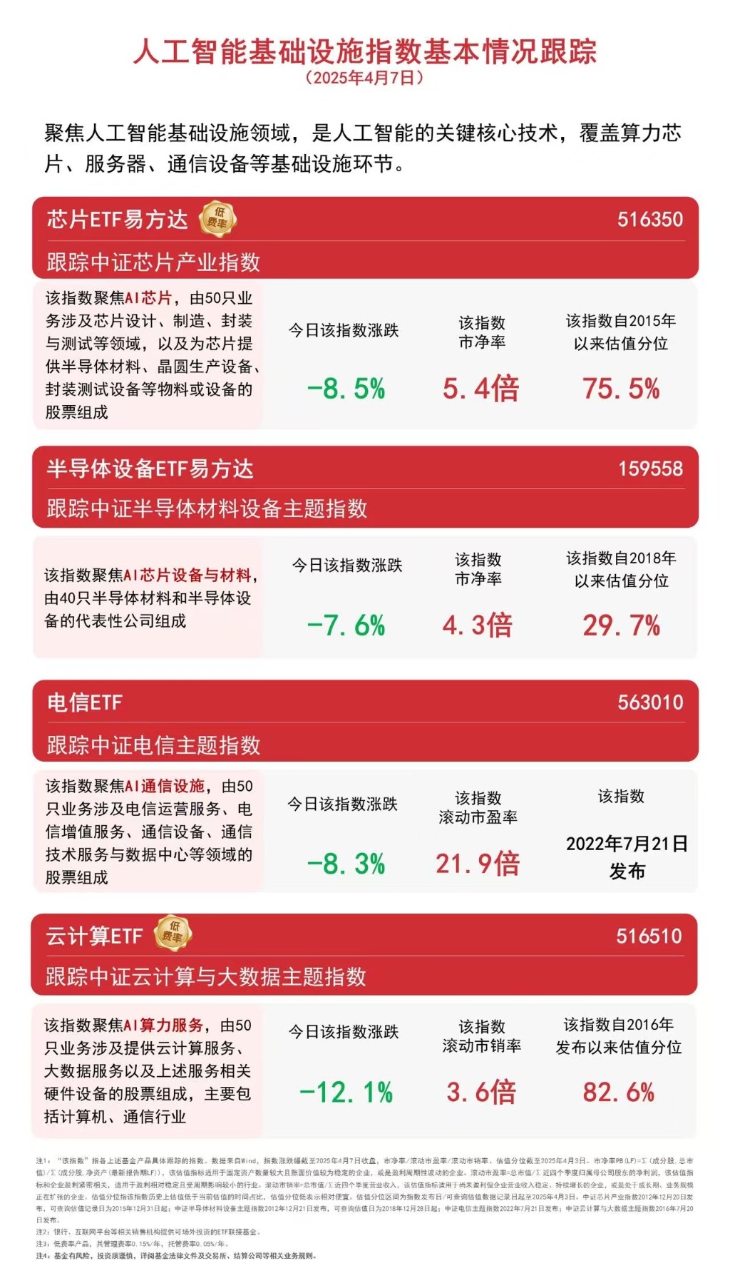 截至收盘,中证半导体材料设备主题指数下跌7.6%,中证电信主题指数下跌8.3%,中证芯片产业指数下跌8.5%,中证云计算与大数据主题指数下跌12.1%。