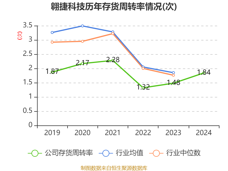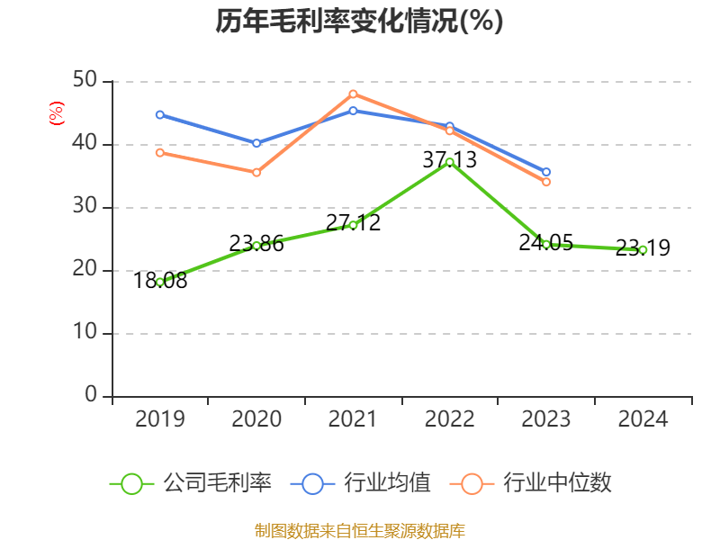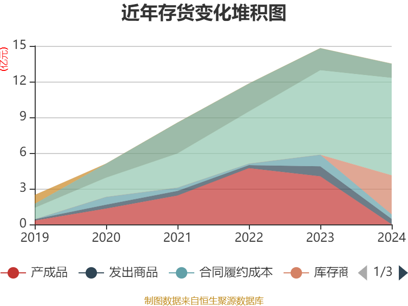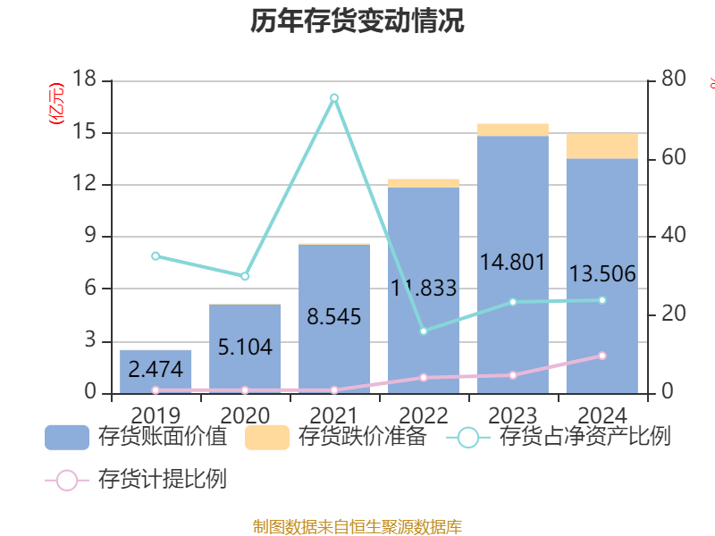从存货变动来看,截至2024年末,公司存货账面价值为13.51亿元,占净资产的23.77%,较上年末减少1.3亿元。其中,存货跌价准备为1.43亿元,计提比例为9.55%。
