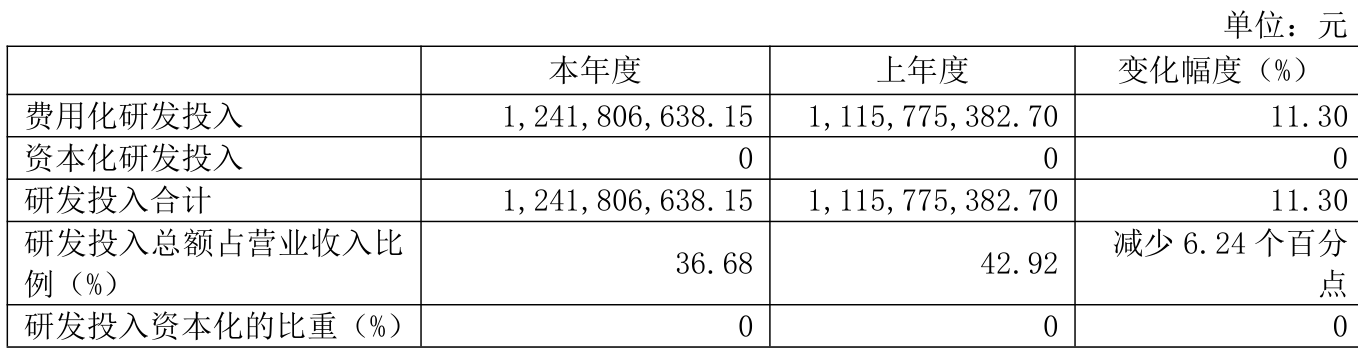 2024年全年,公司研发投入金额为12.42亿元,同比增长11.3%;研发投入占营业收入比例为36.68%,相比上年同期下降6.24个百分点。此外,公司全年研发投入资本化率为0%。