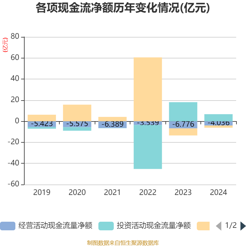 截至2024年,公司经营活动现金流净额为-4.04亿元,同比增加2.74亿元;筹资活动现金流净额-2.08亿元,同比增加4.62亿元;投资活动现金流净额6.7亿元,上年同期为18.08亿元。