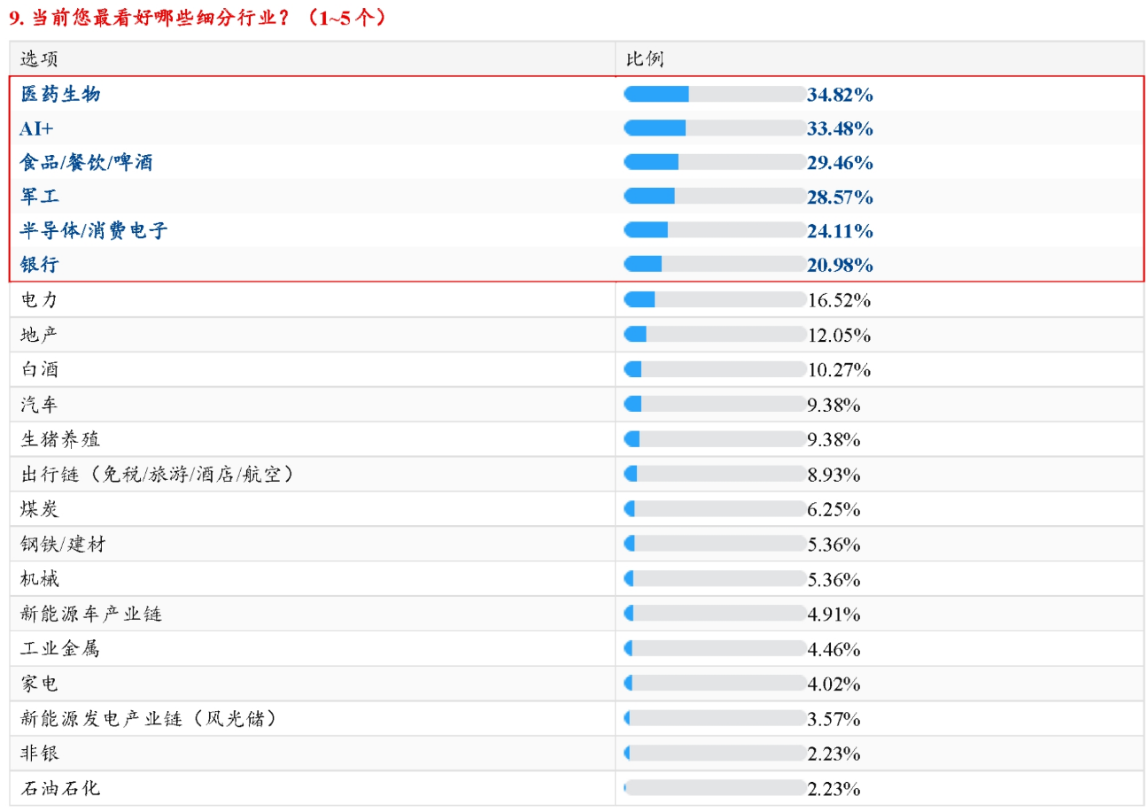 具体到细分行业,当前机构最看好的行业依次为医药生物(占比34.8%)、AI+(占比33.5%)、食品/餐饮/啤酒(占比29.5%)、军工(占比28.6%)、半导体/消费电子(占比24%)、银行(占比21%)。