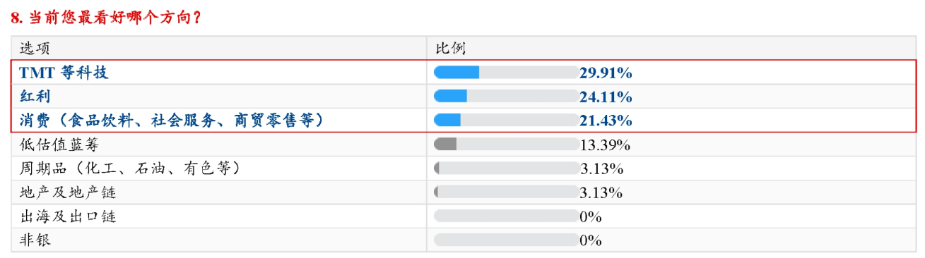 此次关税冲击升级后,某券商策略团队最新对机构做的一项调查显示,当前机构最看好的行业方向为TMT等科技(占比近30%)、红利(占比24%)、消费(食品饮料、社会服务、商贸零售等)(占比21.4%),而对出海及出口链、非银等明显趋于谨慎。