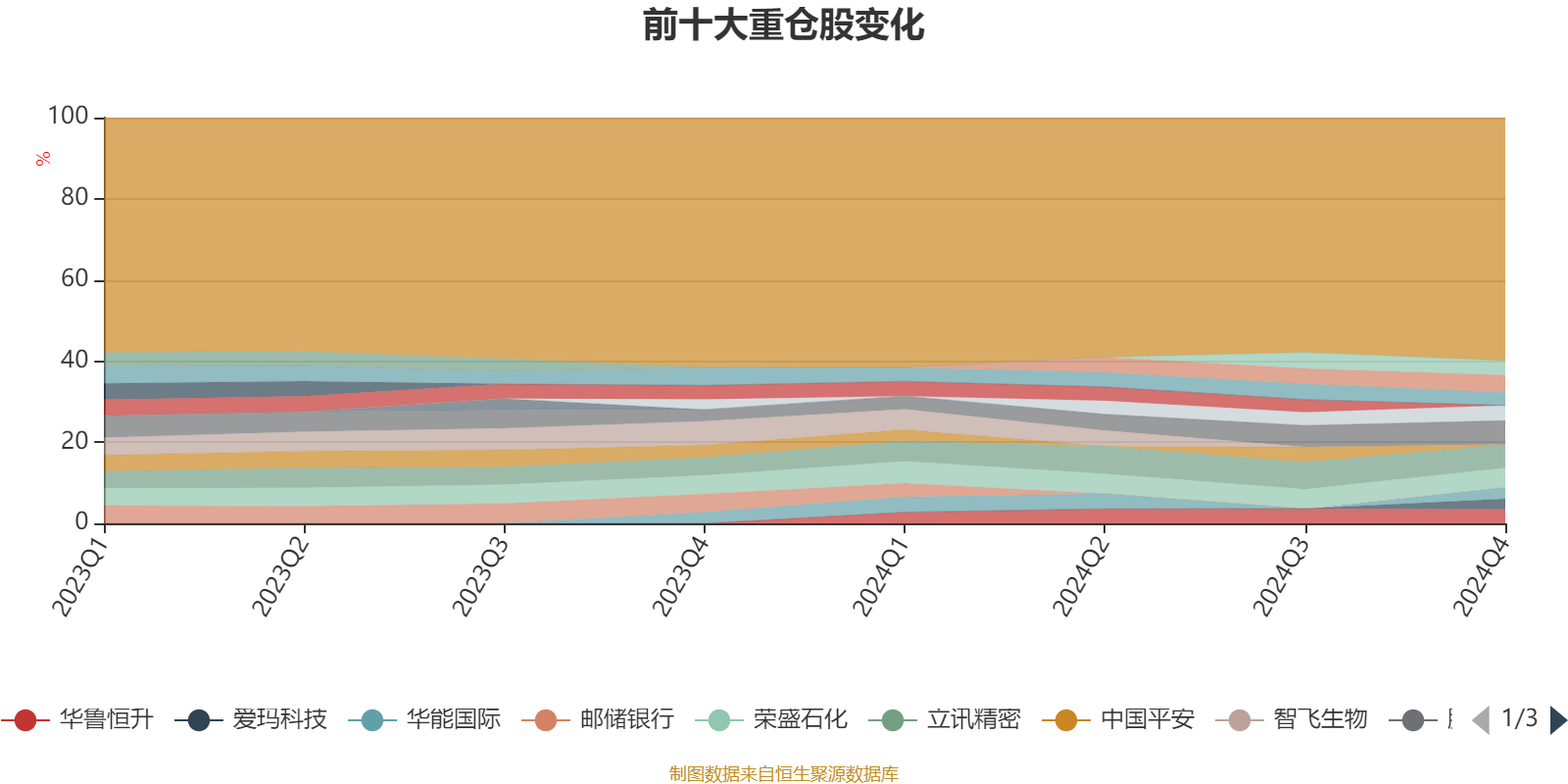 截至2024年末,基金十大重仓股分别是腾讯控股、立讯精密、荣盛石化、兴业银行、生益科技、安踏体育、华鲁恒升、中国建筑、华能国际、爱玛科技。
