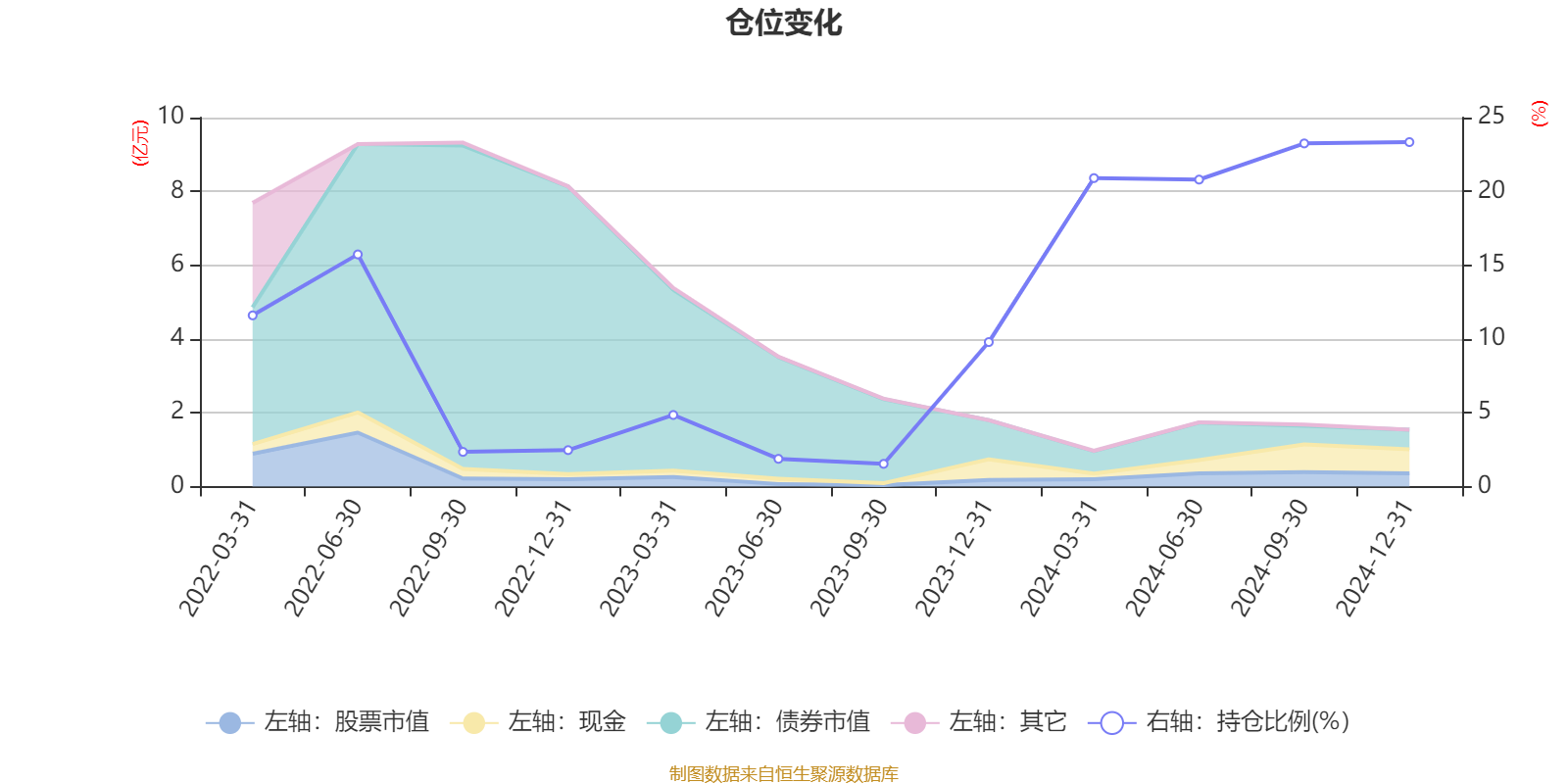 据定期报告数据统计,近三年平均股票仓位为11.54%,同类平均为18.74%。2024年末基金达到23.34%的最高仓位,2023年三季度末最低,为1.54%。