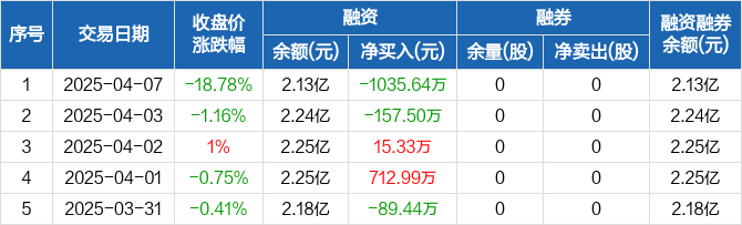 融资方面,当日融资买入1717.96万元,融资偿还2753.6万元,融资净偿还1035.64万元。融券方面,融券卖出0股,融券偿还0股,融券余量0股,融券余额0元。融资融券余额合计2.13亿元。