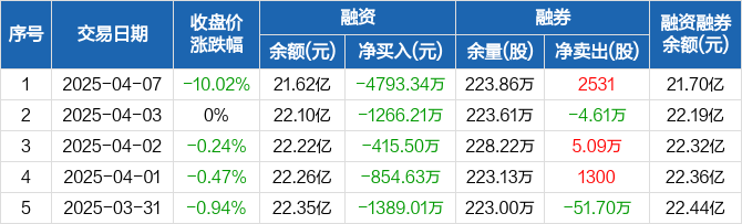 融资方面,当日融资买入8555.45万元,融资偿还1.33亿元,融资净偿还4793.34万元,连续8日净偿还累计1.25亿元。融券方面,融券卖出21.24万股,融券偿还20.99万股,融券余量223.86万股,融券余额843.96万元。融资融券余额合计21.7亿元。
