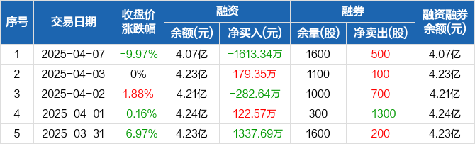 融资方面,当日融资买入1075.9万元,融资偿还2689.24万元,融资净偿还1613.34万元。融券方面,融券卖出500股,融券偿还0股,融券余量1600股,融券余额9392元。融资融券余额合计4.07亿元。