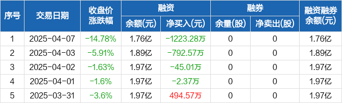 融资方面,当日融资买入1076.89万元,融资偿还2300.17万元,融资净偿还1223.28万元,净偿还额创12个月新高,连续4日净偿还累计2063.23万元。融券方面,融券卖出0股,融券偿还0股,融券余量0股,融券余额0元。融资融券余额合计1.76亿元。
