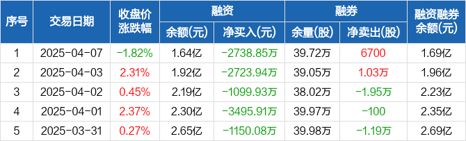融资方面,当日融资买入513.52万元,融资偿还3252.37万元,融资净偿还2738.85万元,连续5日净偿还累计1.12亿元。融券方面,融券卖出2.1万股,融券偿还1.43万股,融券余量39.72万股,融券余额450.04万元。融资融券余额合计1.69亿元。