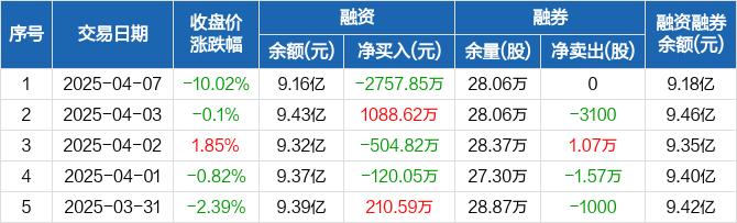 融资方面,当日融资买入2328.1万元,融资偿还5085.95万元,融资净偿还2757.85万元。融券方面,融券卖出0股,融券偿还0股,融券余量28.06万股,融券余额249.45万元。融资融券余额合计9.18亿元。